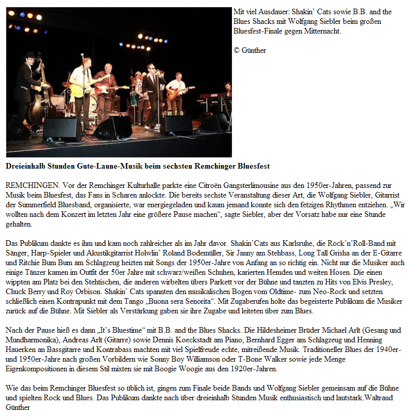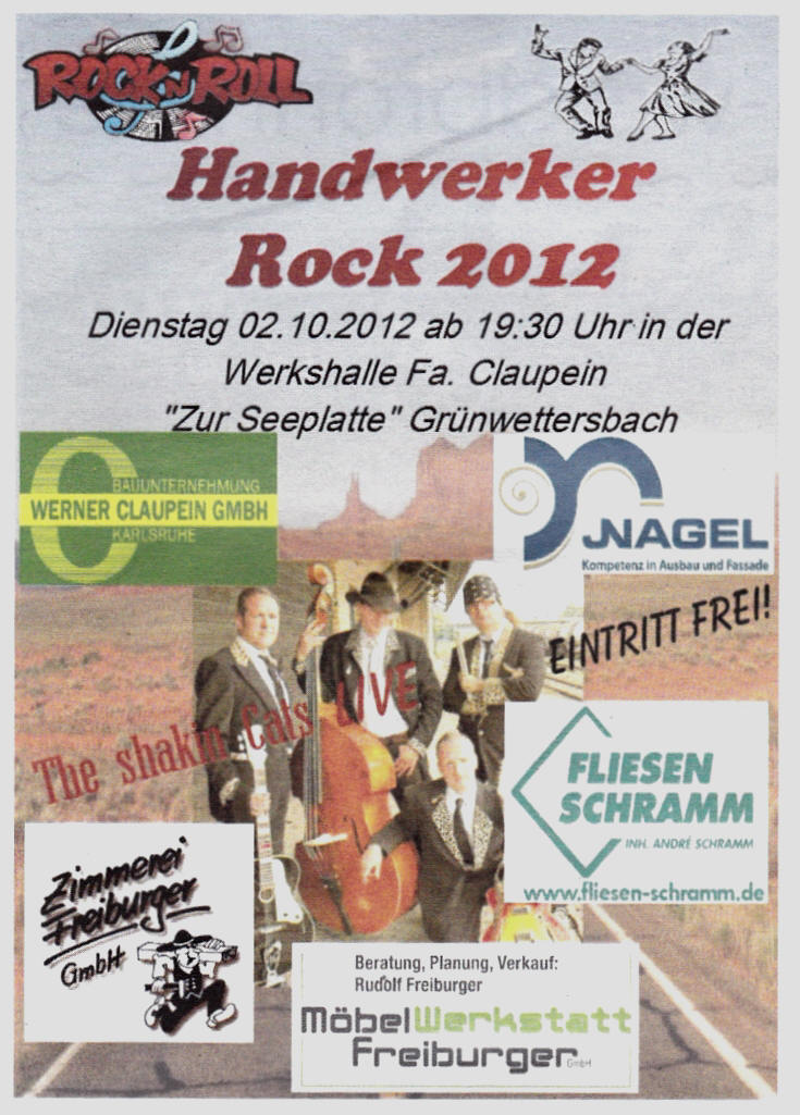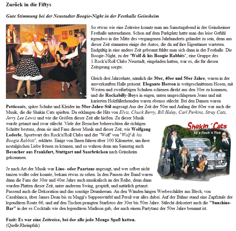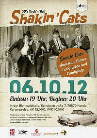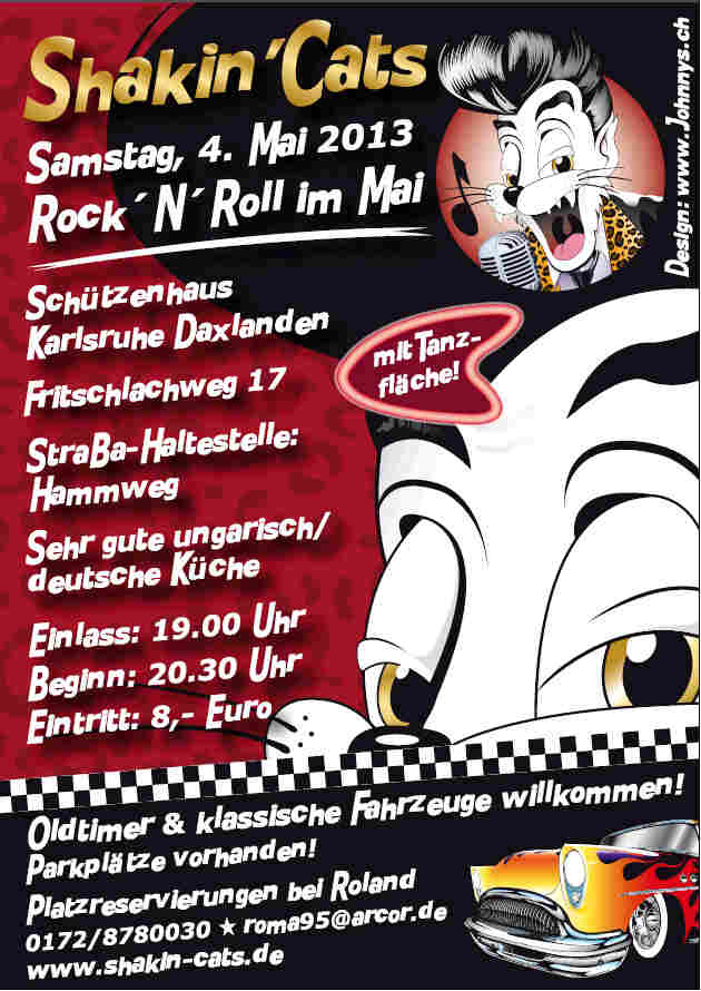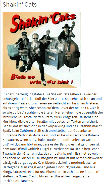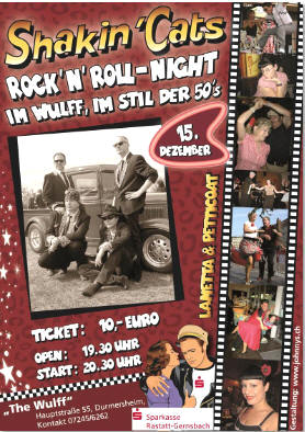 50s Rock`n`Roll is still alive ! Die Shakin'Cats lassen den Rock`n`Roll wieder so richtig aufleben ! Schnell, mitreißend und garantiert schnörkellos kommt die Musik, die niemanden still stehen lässt, serviert im authentischen Outfit und dem Originalsound der 50er Jahre. Sie spielen neben eigene Songs (oder eigene Rock'n''Roll Kracher), Klassiker von Elvis, Stray Cats, Gene Vincent, Chuck Berry, Shakin` Stevens, Carl Perkins, Jerry Lee Lewis - um nur einige zu nennen. Die Shakin`Cats, bühnenbewährt teilweise seit über 35 Jahren, spielen in klassischer Rock´n´Roll Besetzung: Long Tall Grischa hat einen Supersound an der Fender Coronado, Ritchie B.B. trommelt sich die Seele aus dem Leib, Sir Janny zupft und slappt den Kontrabass, Roland the Howlin singt und spielt Bluesharp, dass einem Hören und Sehen vergeht........ Sie lassen die Zeit wieder auferstehen, als Kids noch Halbstarke hießen, Casting Bands noch nicht erfunden waren, das Wirtschaftwunder boomte und die Rock´n`Roll Hits aus sämtlichen Autoradios dröhnten. Zu sehen und zu hören sind die Shakin`Cats bei Rock'n'Roll Clubs, Oldtimer- bzw. Rock'n'Roll Großveranstaltungen wie auch bei fetzigen 50s Parties in vielen Live Musikclubs ! Ja, das war eigentlich das Wesentliche an dieser Musik: Mann/Frau musste Tanzen, ob Mann/Frau wollte oder nicht, der Rhythmus ließ da dem Körper keine Wahl, du musstest dich einfach in diesem vorgegebenen Tempo bewegen. Und das sollten Sie - liebe Besucher/in - an diesem Abend auch tun! Den entsprechenden Platz werden wir ihnen zu Verfügung stellen.Lassen Sie sich doch vom Rhythmus der Shakin`Cats in ein entspanntes Wochenende treiben.