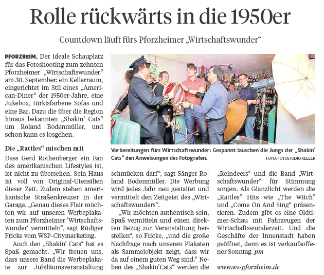 original 50er – das zieht ! Damals und heute: Nietenhosen – heute Jeans Milchbar – heute Biergarten Wirtschaftswunder – heute wundert man sich 50er Sound – heute immer noch 50er Sound! Mit Shakin’ Cats ist alles möglich. |